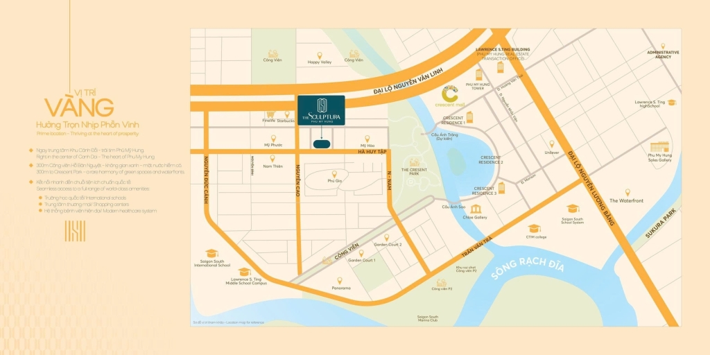 Vị trí trung tâm, kết nối mạnh: giáp các trục đường lớn, gần Crescent Mall, Crescent Lake, các tiện ích giáo dục, y tế, thương mại trong khu Phú Mỹ Hưng — giúp cư dân dễ dàng tiếp cận mọi nhu cầu hàng ngày.
